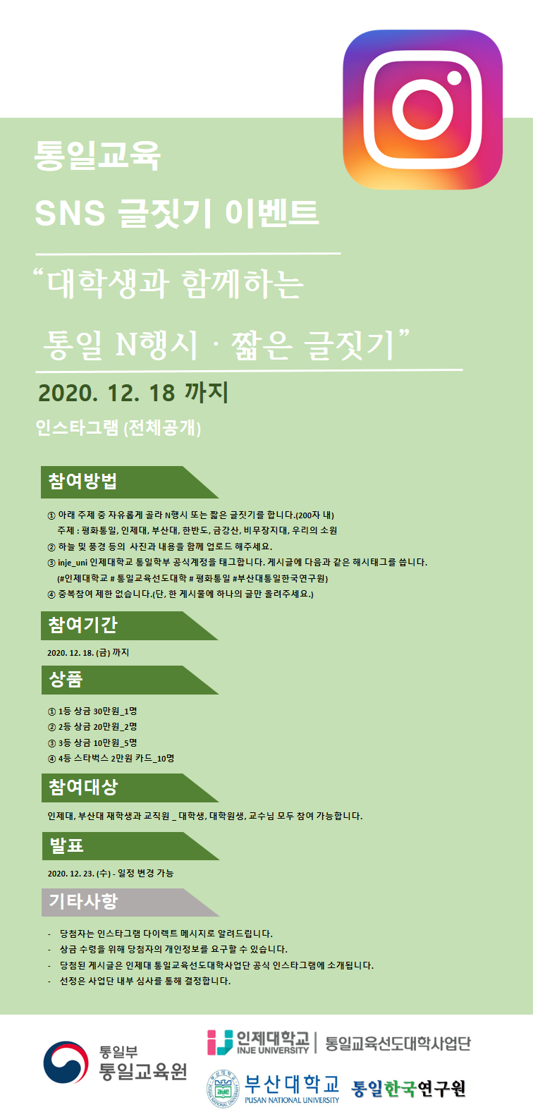 【인제대 통일교육선도대학사업단】 통일교육 SNS 글짓기 이벤트(~20.12.18.)